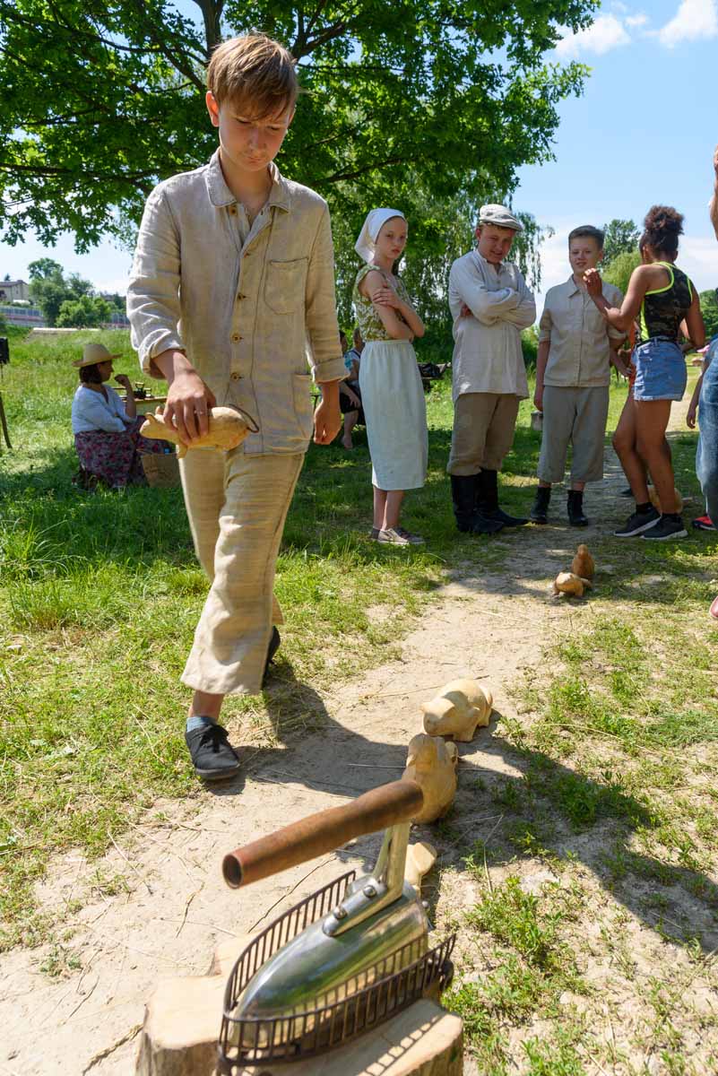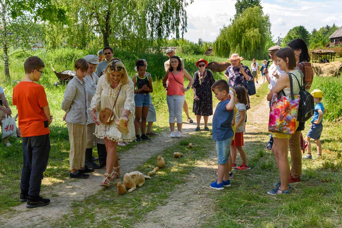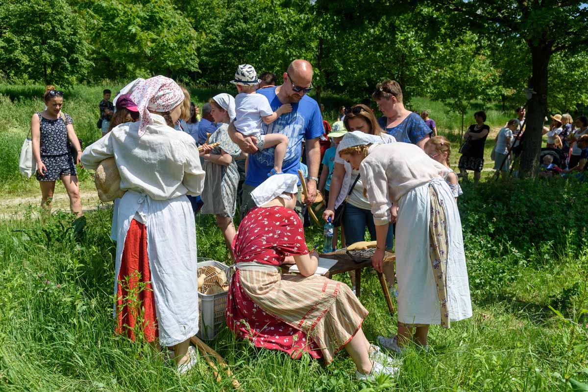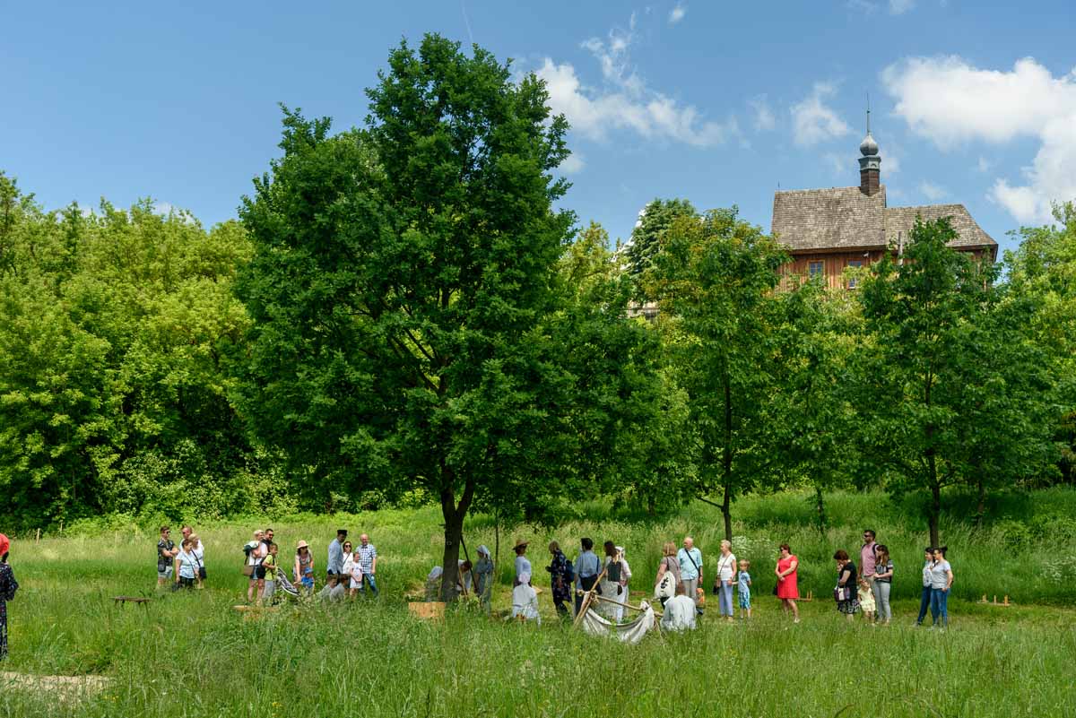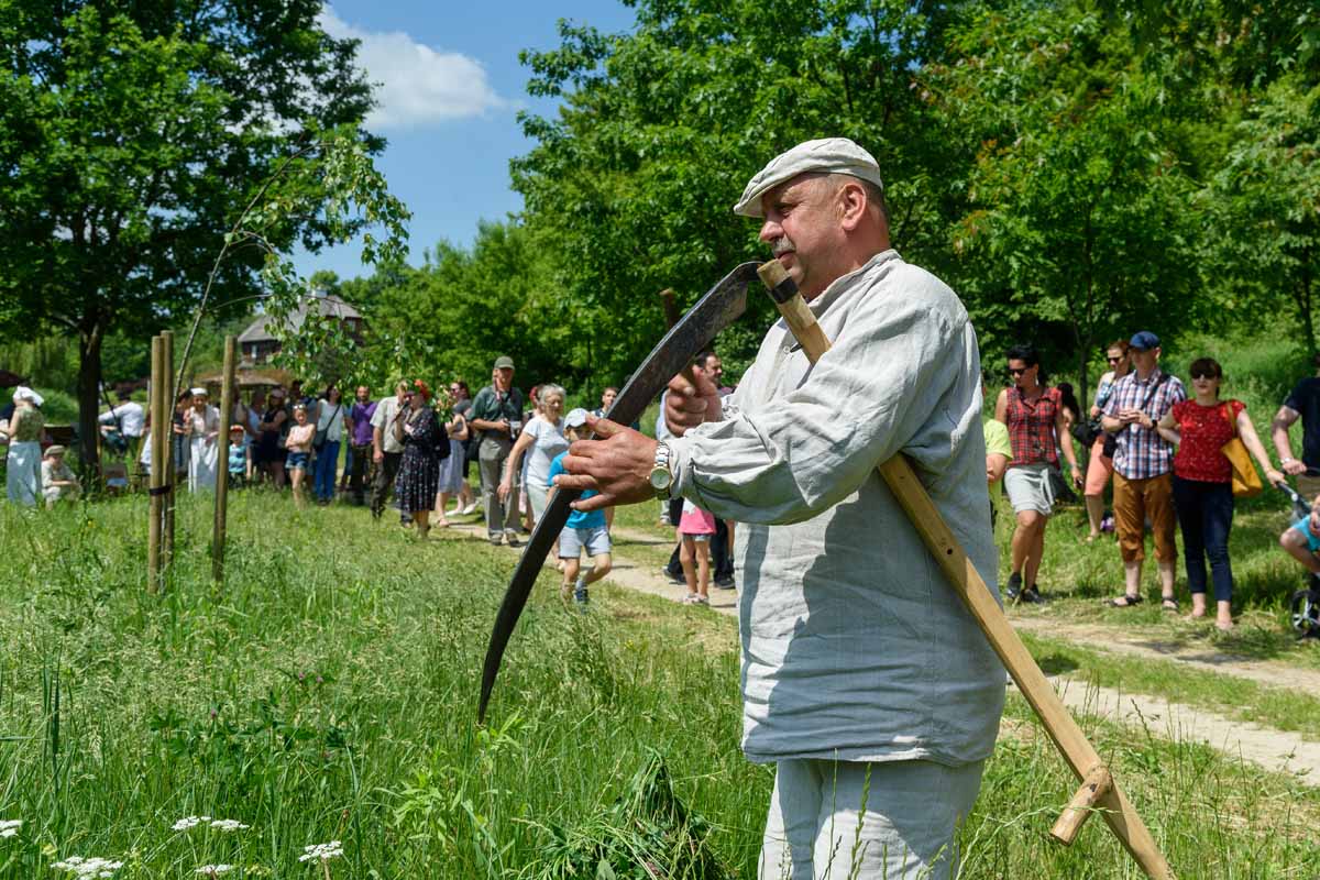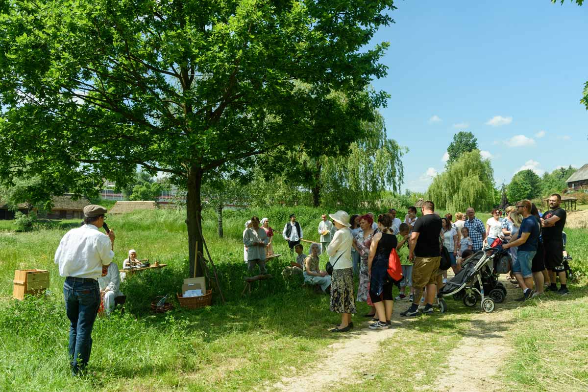 Matka Marianna grabi siano, więc tylko wiatr poruszać będzie płachtą polowej kołyski. Za nią „łąkowy plac zabaw” dla najmłodszych Gości Muzeum. Instalacja przecież etnograficznie nieprawdziwa – lecz tego dnia praktyczna i z nastawieniem edukacyjnym. To tam zagramy w derkacza i w inne gry zręcznościowe. Z pomocą rekwizytów dzieci wspólnie z kustoszem rozwiążą zagadki związane z odwiecznym gospodarowaniem na roli. Udomowimy zwierzęta, wypatrzymy na drzewach narzędzia samorodne, utrzemy mąkę na prymitywnych żarnach nieckowatych.