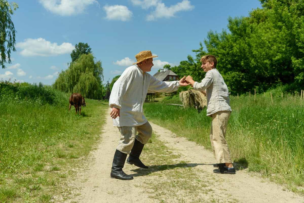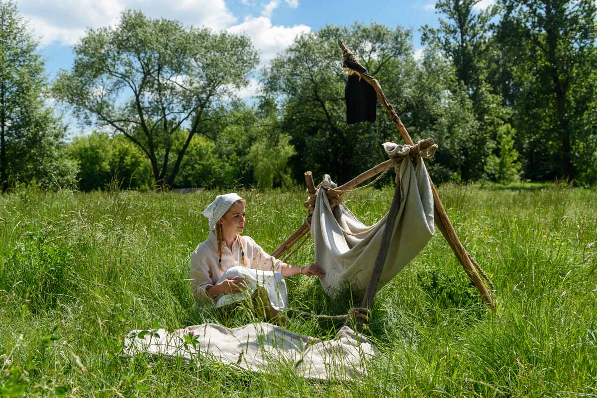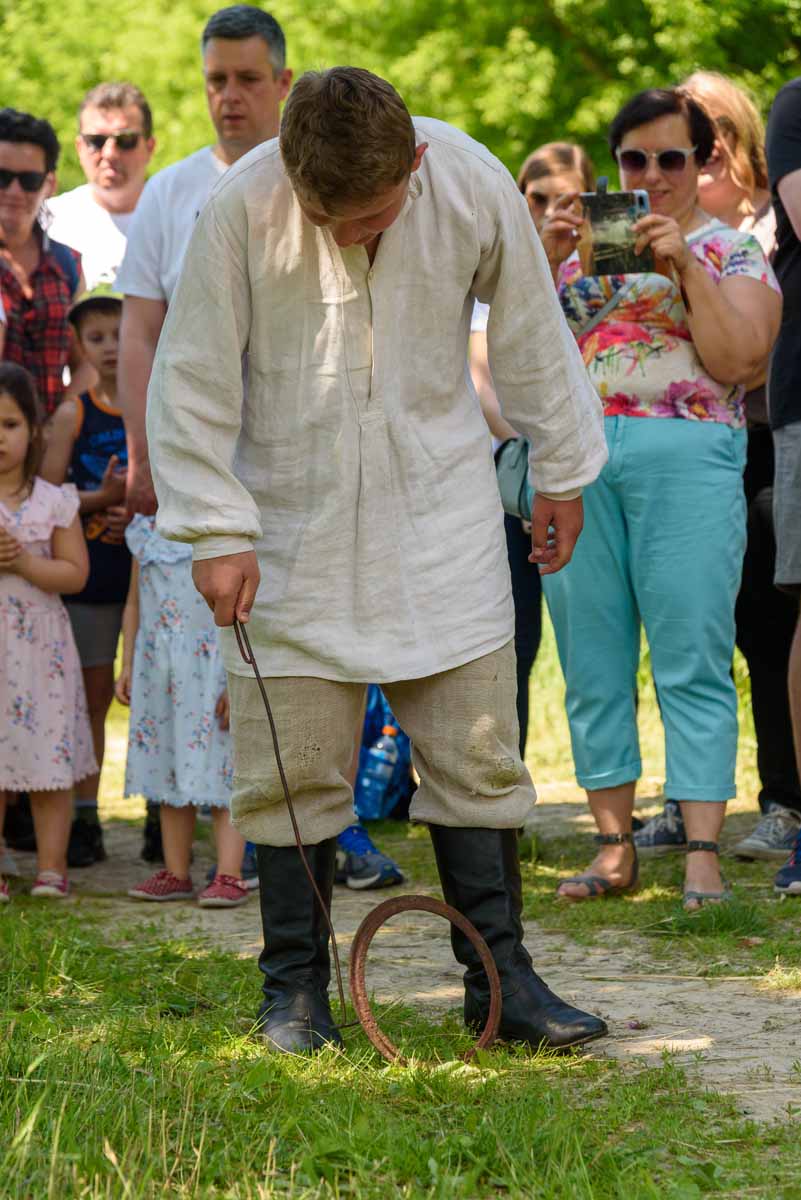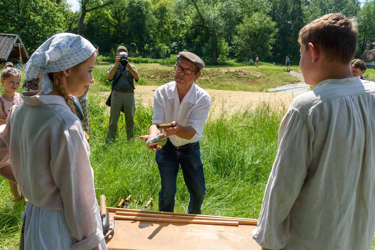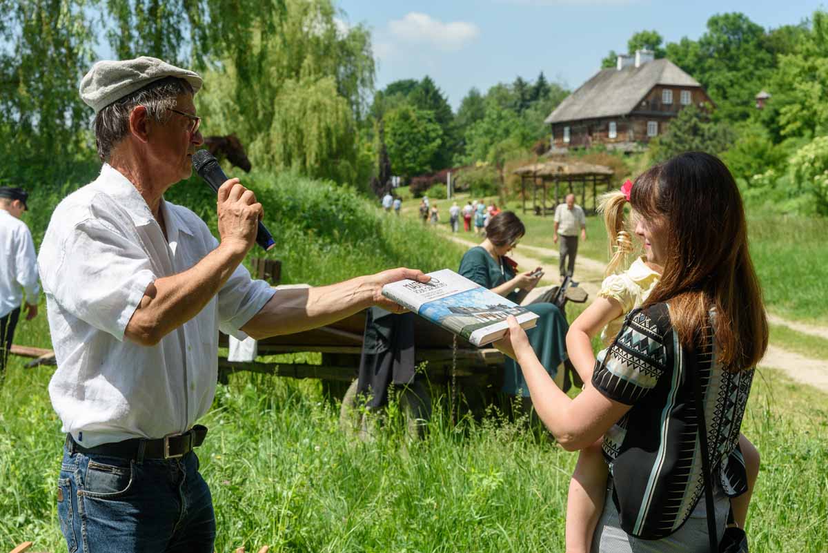 Matka Marianna grabi siano, więc tylko wiatr poruszać będzie płachtą polowej kołyski. Za nią „łąkowy plac zabaw” dla najmłodszych Gości Muzeum. Instalacja przecież etnograficznie nieprawdziwa – lecz tego dnia praktyczna i z nastawieniem edukacyjnym. To tam zagramy w derkacza i w inne gry zręcznościowe. Z pomocą rekwizytów dzieci wspólnie z kustoszem rozwiążą zagadki związane z odwiecznym gospodarowaniem na roli. Udomowimy zwierzęta, wypatrzymy na drzewach narzędzia samorodne, utrzemy mąkę na prymitywnych żarnach nieckowatych.