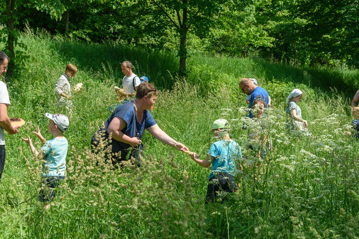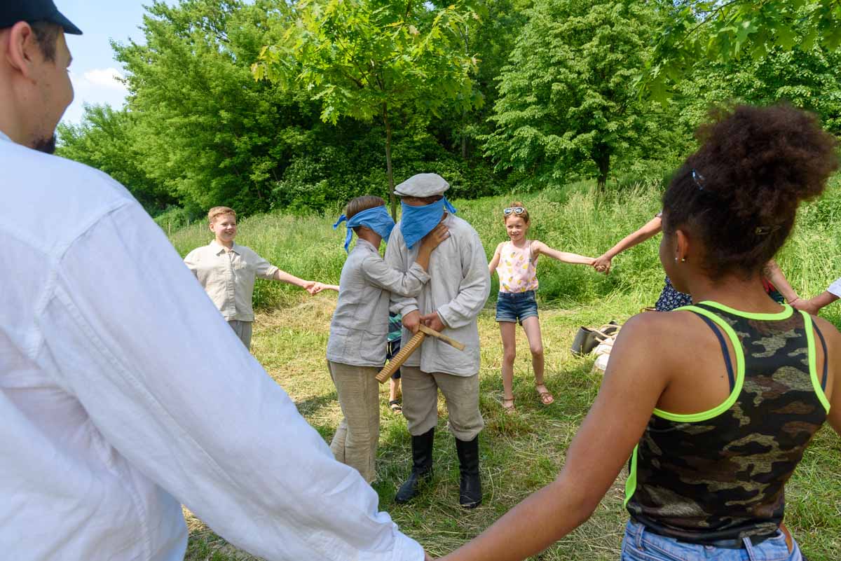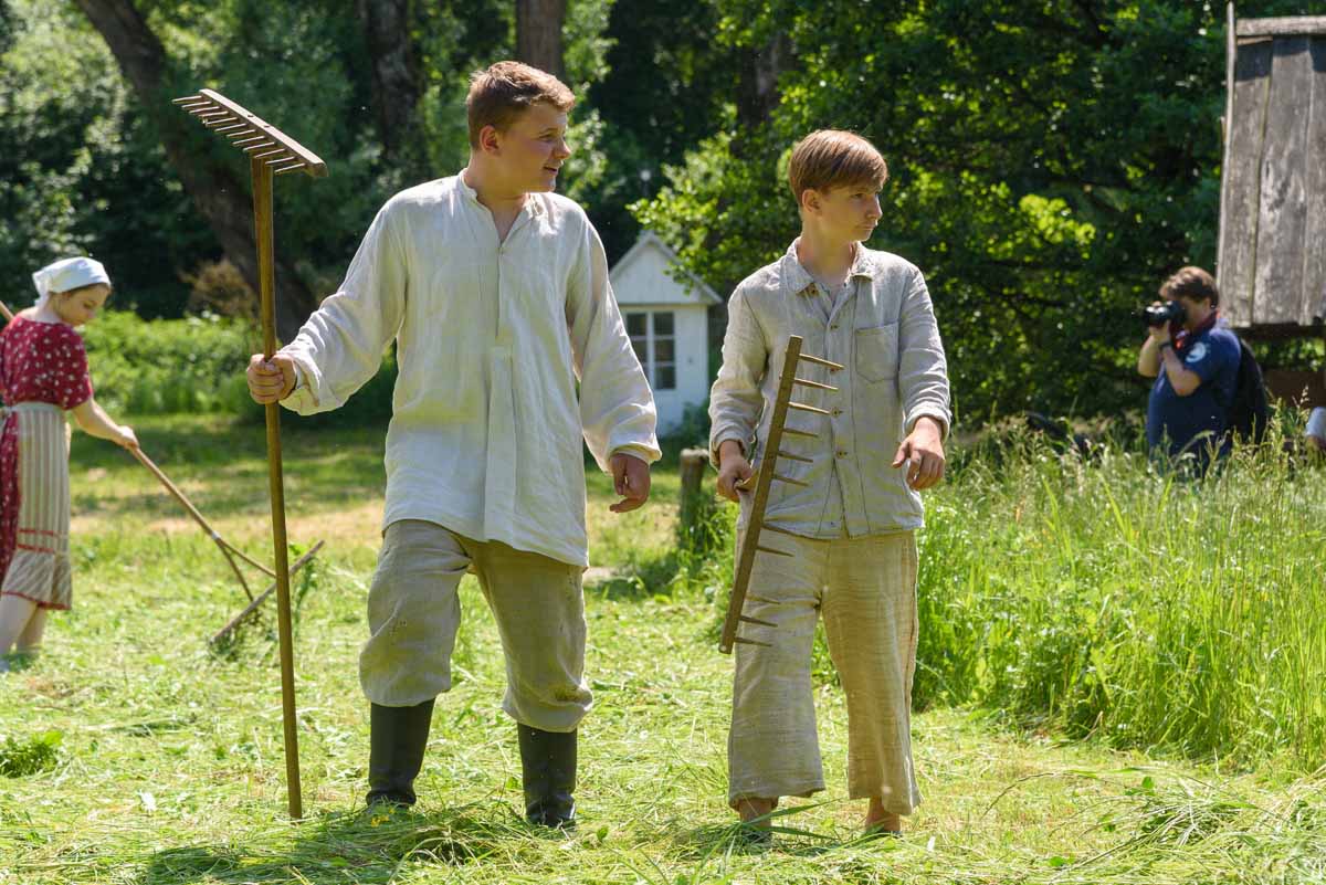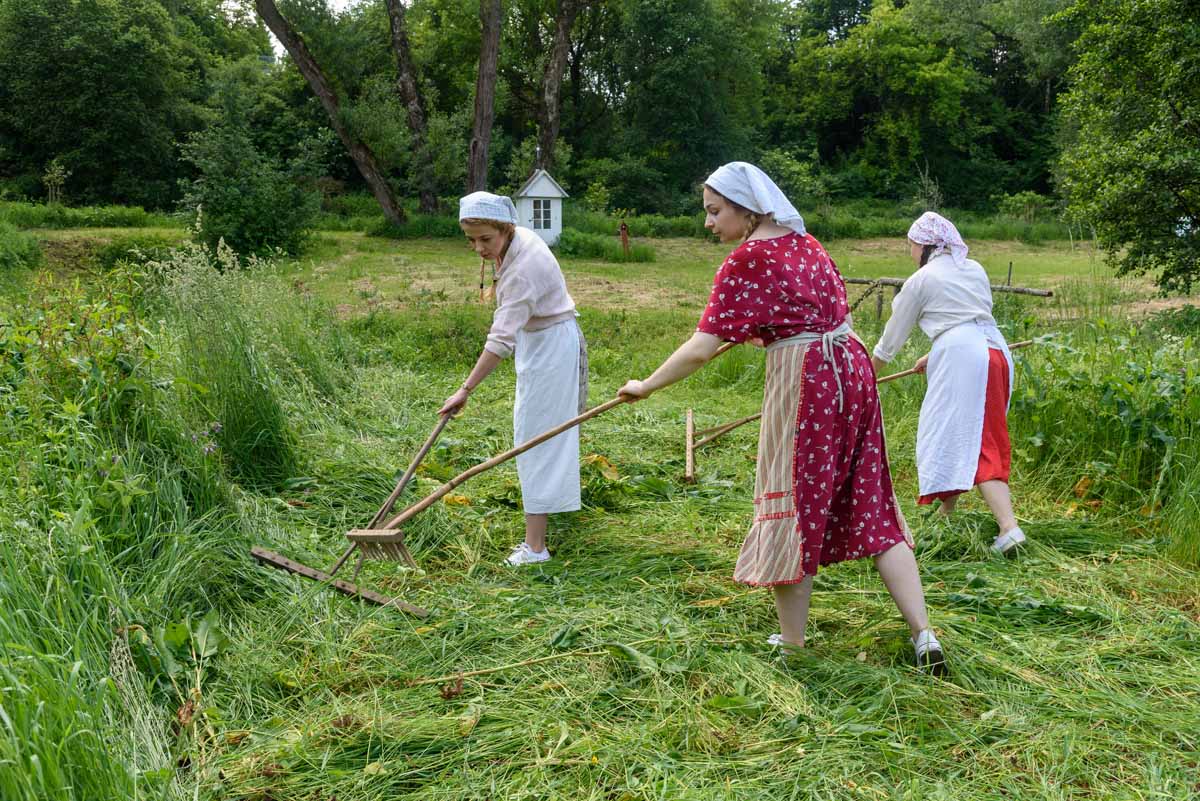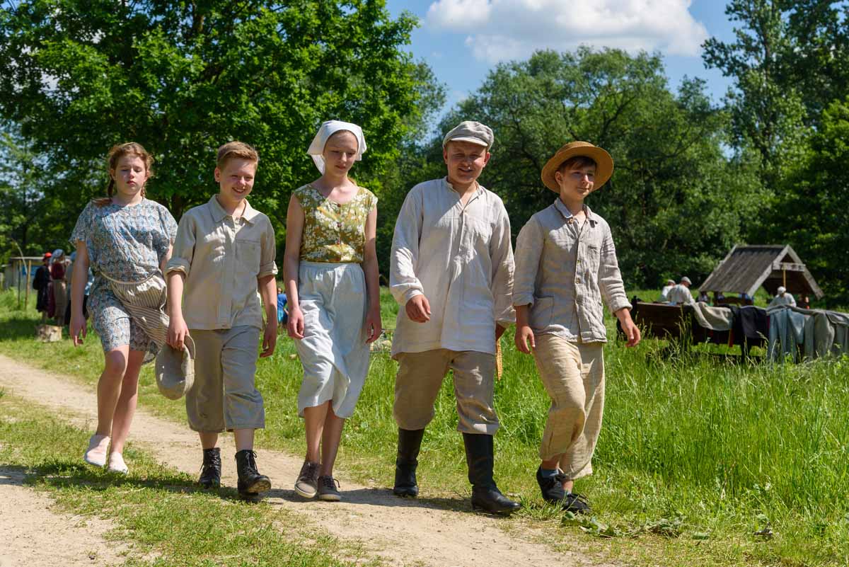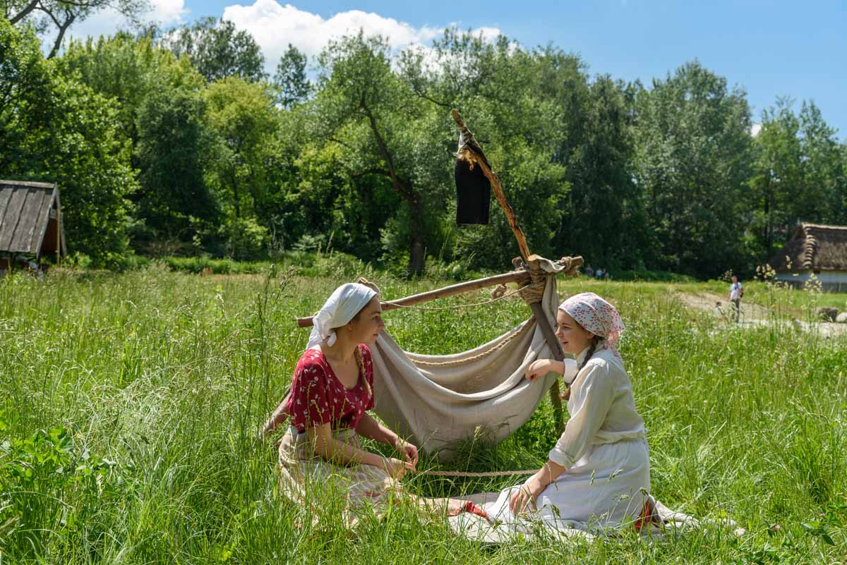 Matka Marianna grabi siano, więc tylko wiatr poruszać będzie płachtą polowej kołyski. Za nią „łąkowy plac zabaw” dla najmłodszych Gości Muzeum. Instalacja przecież etnograficznie nieprawdziwa – lecz tego dnia praktyczna i z nastawieniem edukacyjnym. To tam zagramy w derkacza i w inne gry zręcznościowe. Z pomocą rekwizytów dzieci wspólnie z kustoszem rozwiążą zagadki związane z odwiecznym gospodarowaniem na roli. Udomowimy zwierzęta, wypatrzymy na drzewach narzędzia samorodne, utrzemy mąkę na prymitywnych żarnach nieckowatych.
