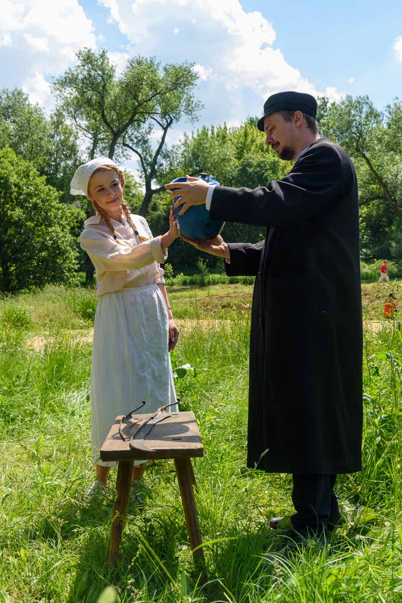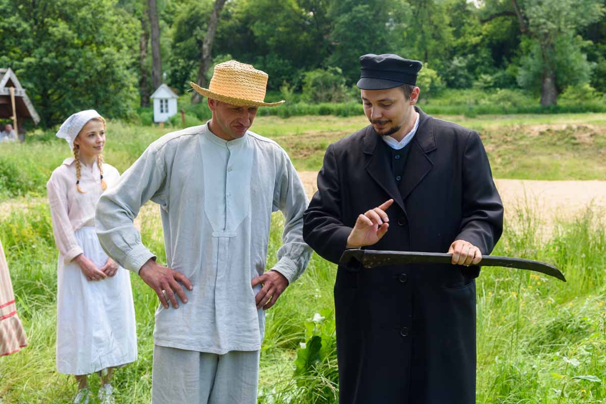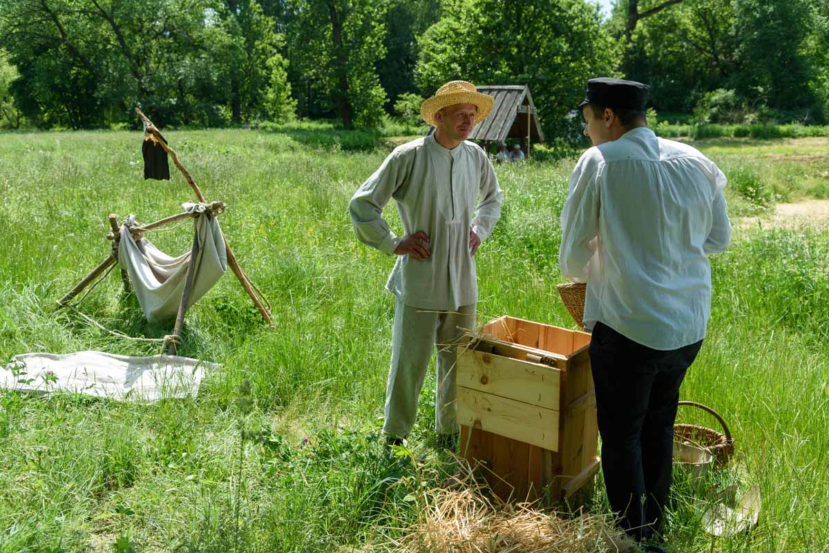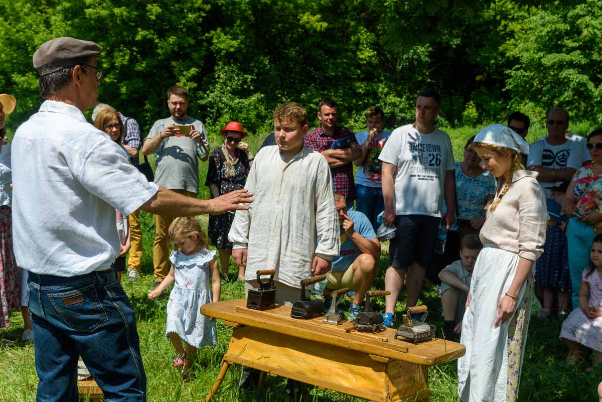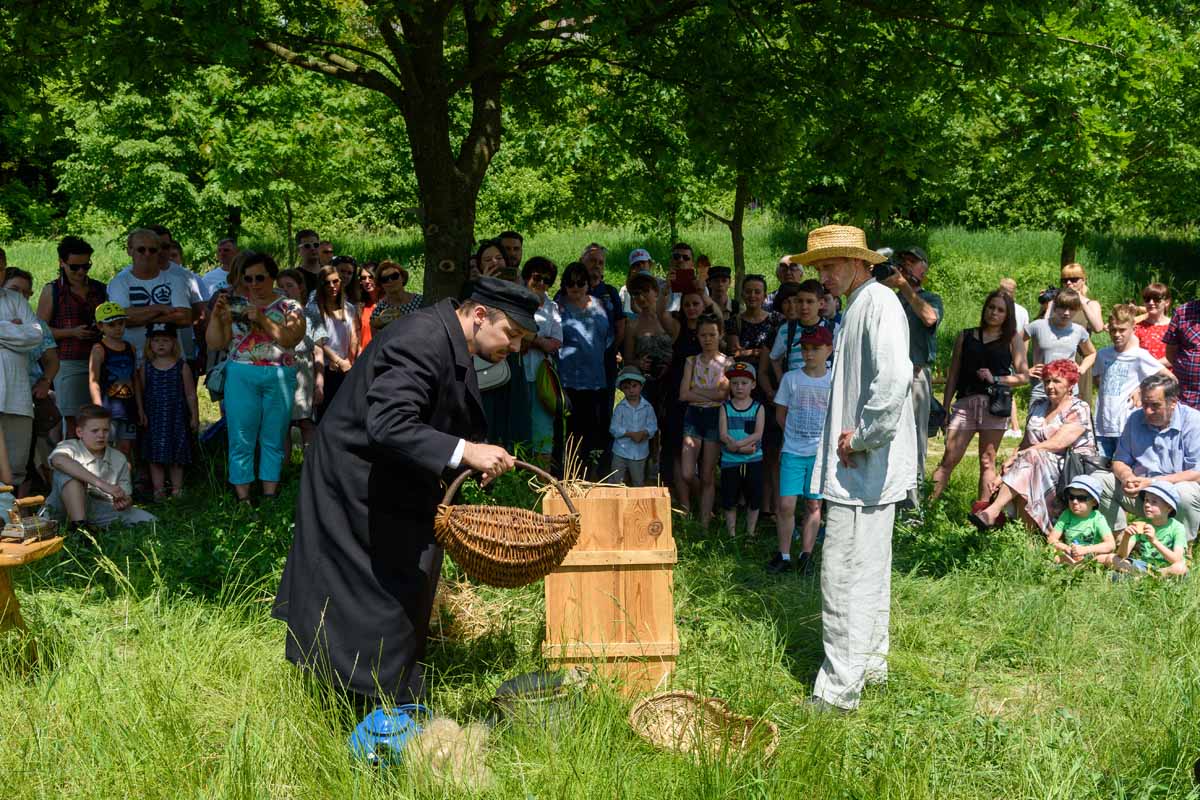 Na moment przy kosiarzu przycupnie domokrążca ze skrzynią, w której niesie złom, jajka, ziemniaki i lniane warkocze Matki Polki. Kustosz wszystko będzie pokazywać i tłumaczyć.