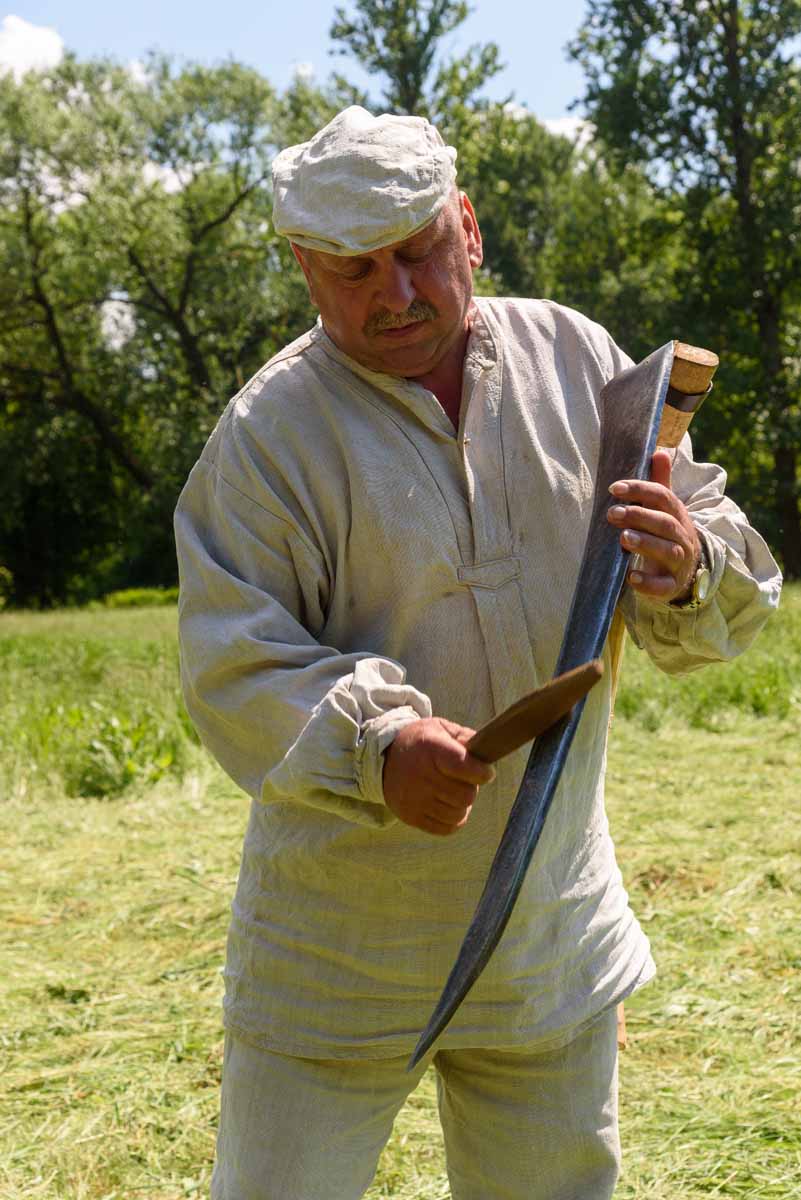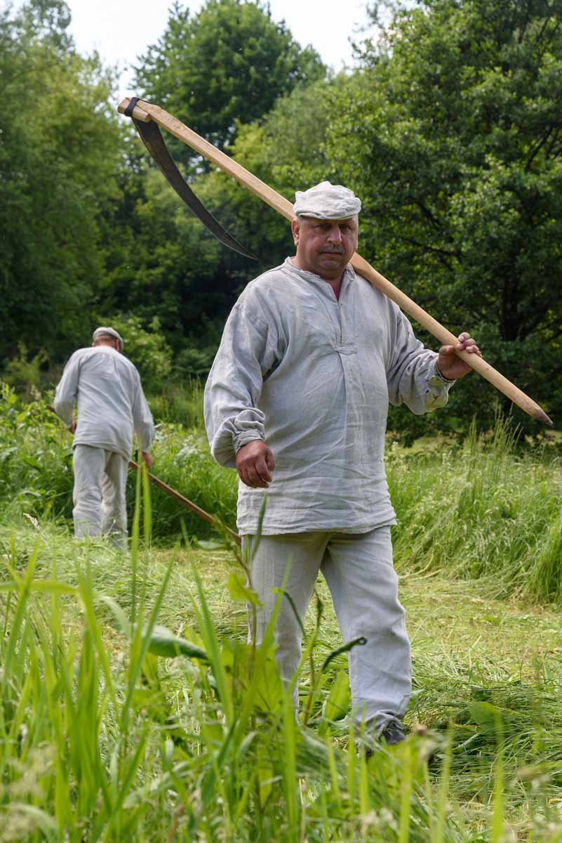 Wkrótce ruszą też do swojej pracy kosiarze w wybielonych słońcem lnianych koszulach i gaciach. Kilka minut wcześniej na ”babce” wbitej w pień podklepywali kosy w cieniu wierzb.