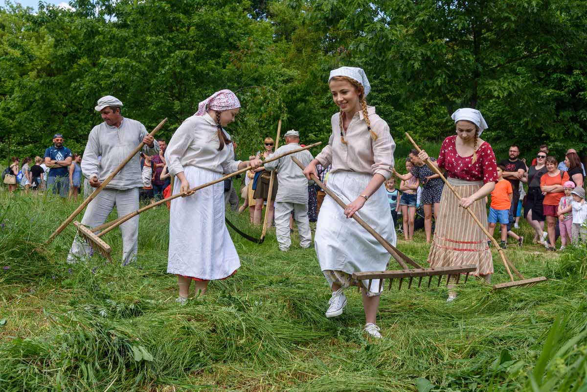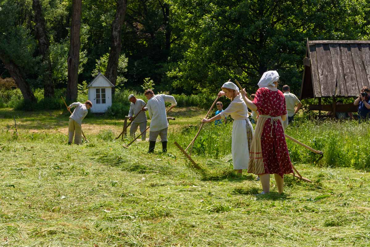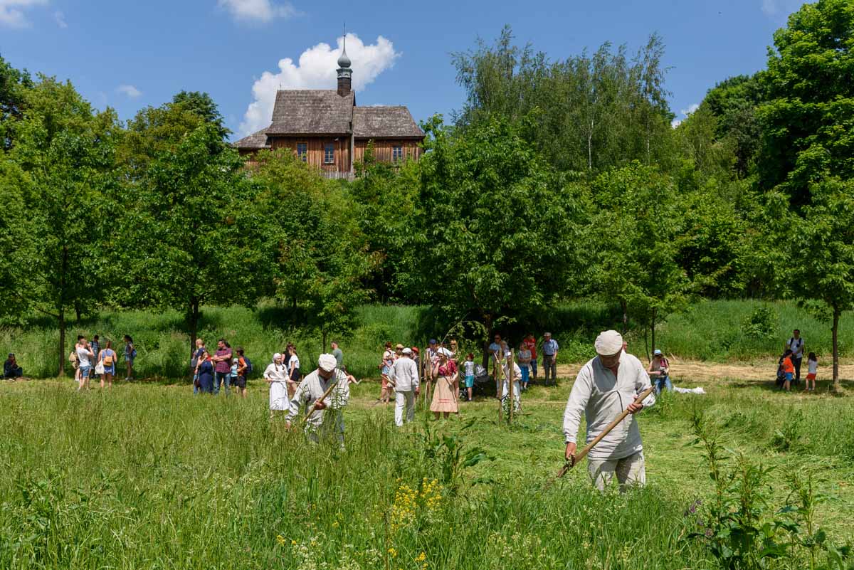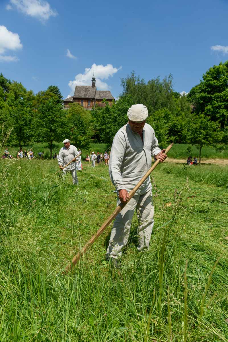 Sianokosy, żniwa, wykopki – utrzymać rodzinę i inwentarz – takie pragnienie towarzyszyło naszym wiejskim, ziemiańskim i miasteczkowym przodkom. Od chwili udomowienia zwierząt roślinożernych, zgromadzone przez ludzi zapasy siana wspierały w okresie zimowym bydło, konie, kozy, owce. Zwierzęta coraz bardziej odzwyczajały się od samodzielnego poszukiwania pokarmu i naciskały na ludzi aby czynili sianokosy, najlepiej, da Bóg, trzy razy w roku. Tak więc i w tym roku spotkamy się 2 czerwca na sianokosach – na łąkach nad Czechówką w Muzeum Wsi Lubelskiej. Najpierw ruszymy z ekologiczną intencją aby kosiarze nie skrzywdzili zajęcy, myszy, węży, żab, piskląt, bąków, koników polnych, gniazd i pajęczyn. Wszystkie te łąkowe stworzenia – dzieło rzeźbiarza i druciarza, Goście sianokosów będą mogli uratować tocząc szlachetną rywalizację.